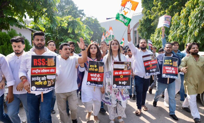 भारतीय युवा कांग्रेस ने केरल के 26 वर्ष के युवा को न्याय दिलाने के लिए RSS के खिलाफ किया विरोध प्रदर्शन